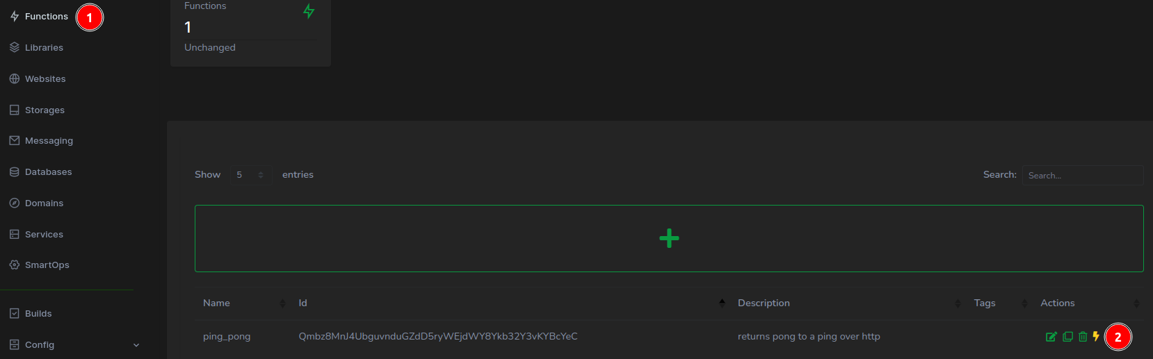 With the build phase complete, it’s time to put your function to the test. From the Taubyte console’s left sidebar, (1) select Functions, then (2) click the thunderbolt icon adjacent to your newly created function.