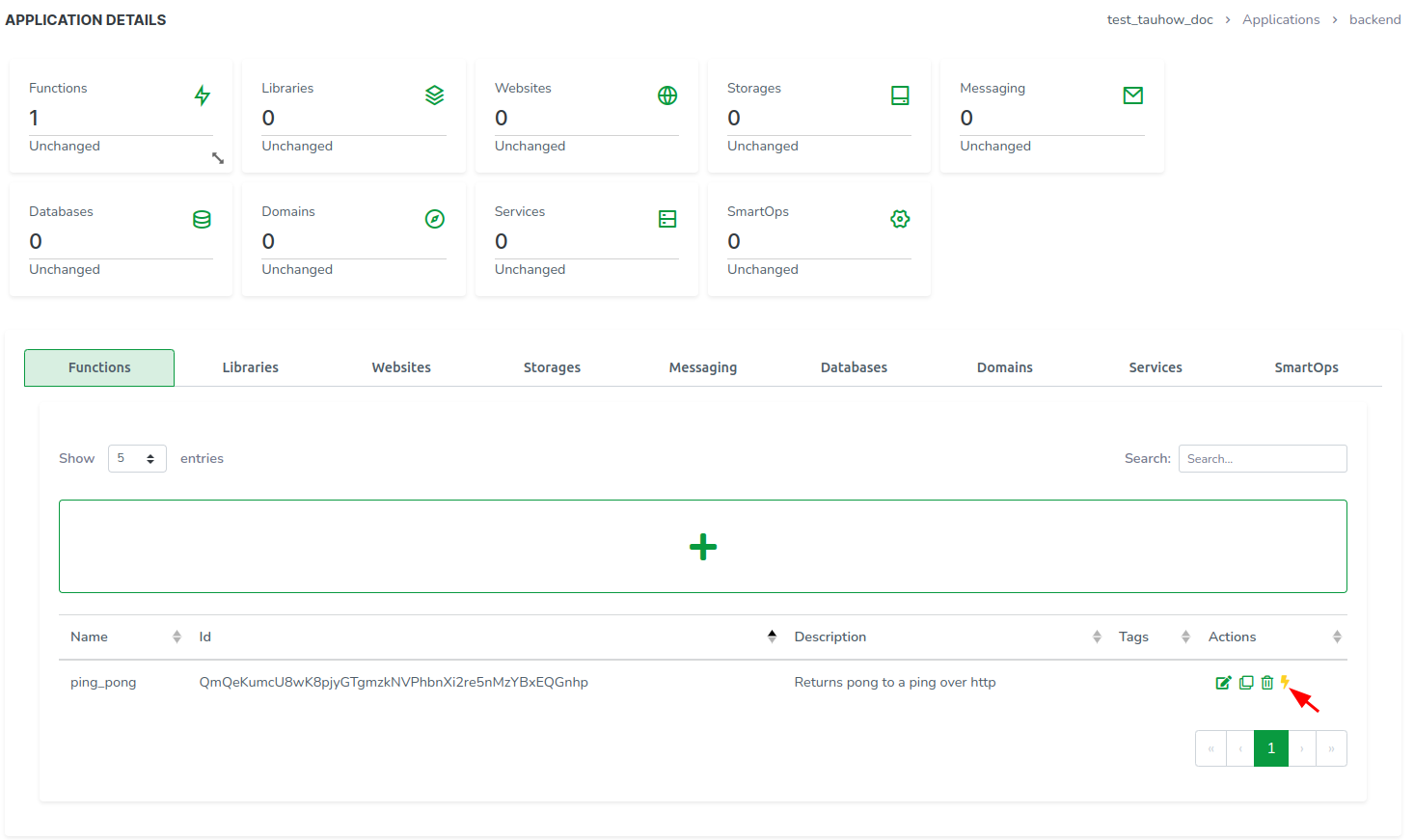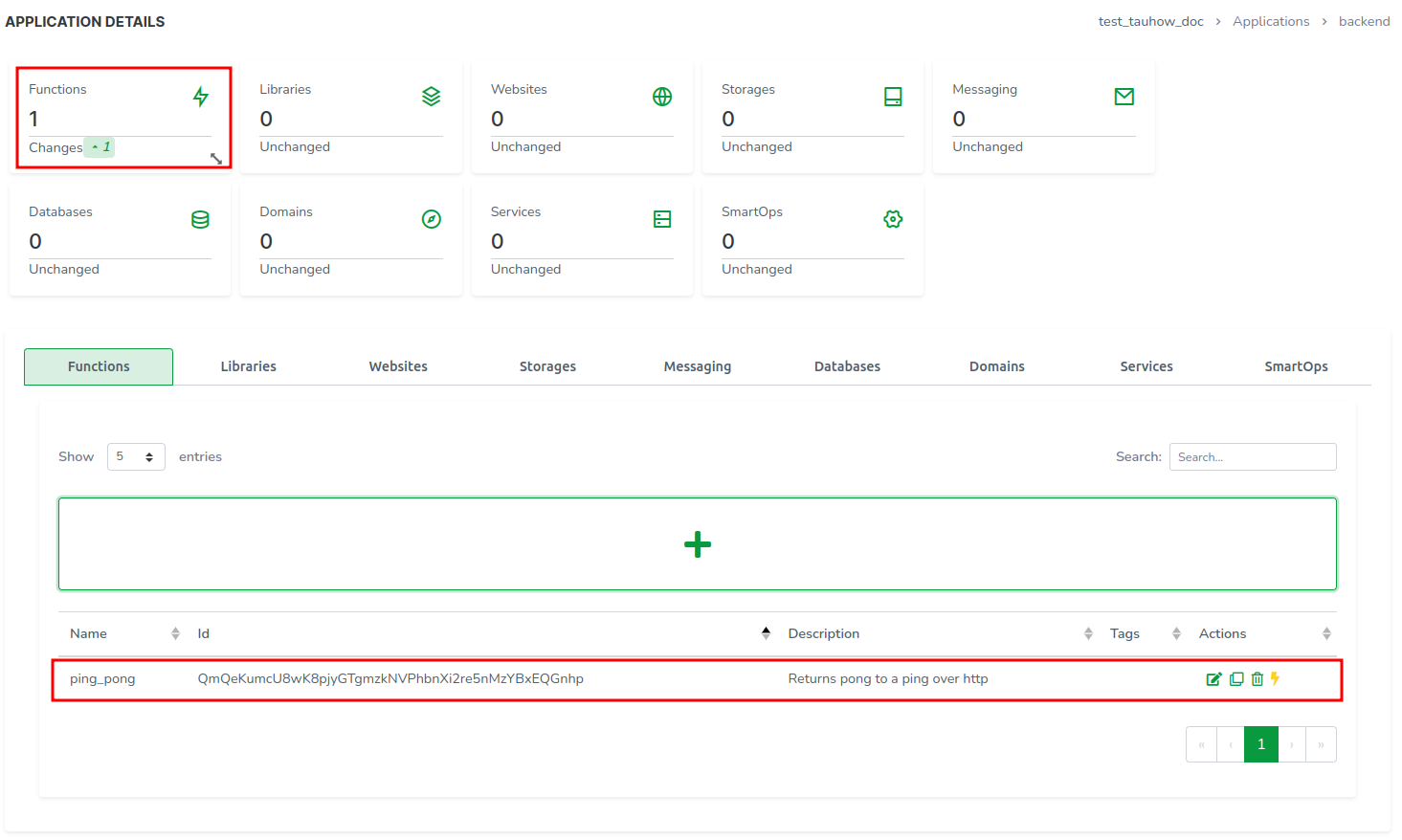 Let's create a function in our application. In the function tab, click on the + button. Then select the ping_pong template, ake sure we're using generated domain, and use /backend/ping as the path.