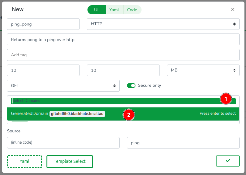 The template fills most fields automatically. For domains, click the dropdown and select GeneratedDomain to create a new domain resource