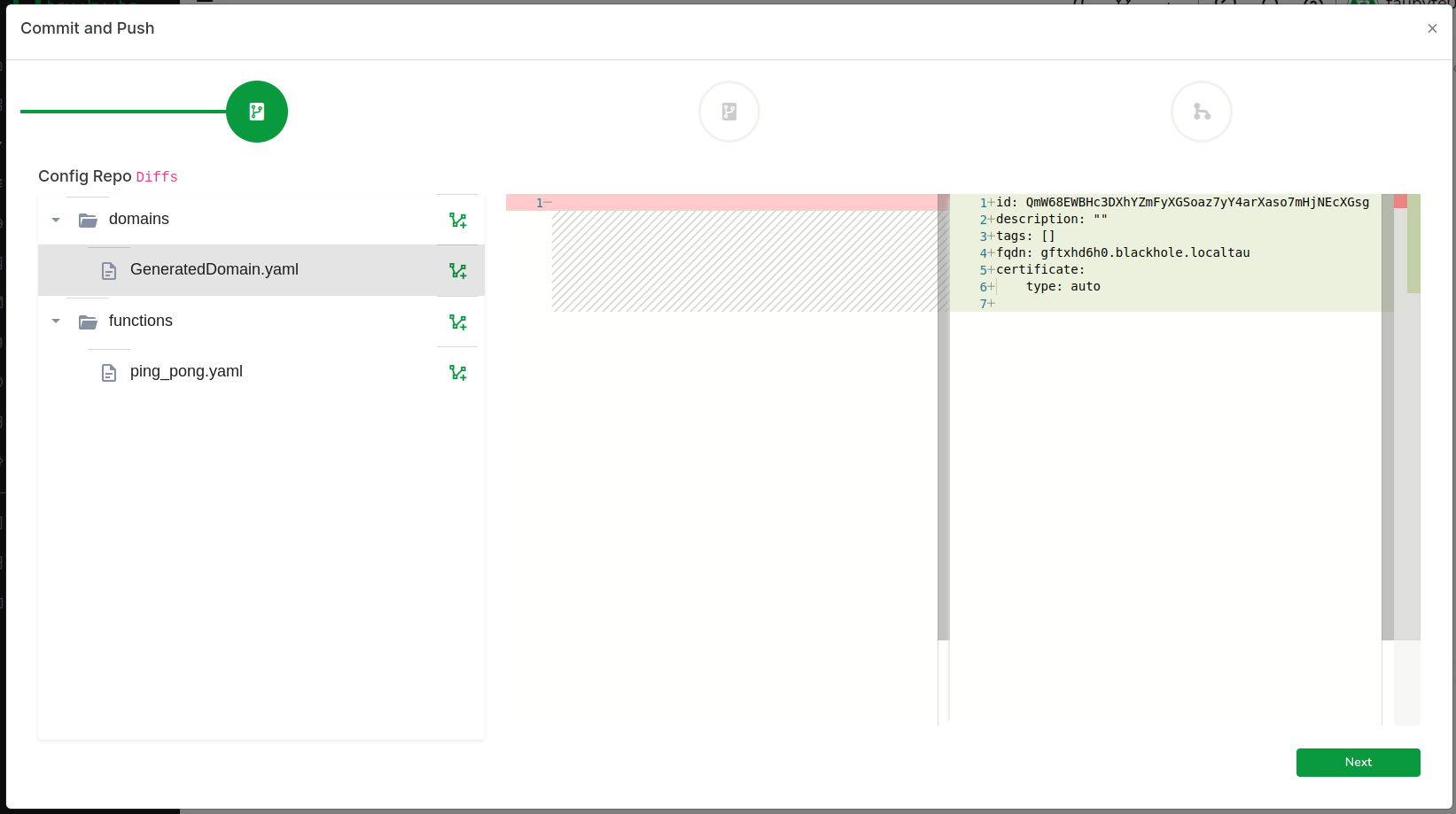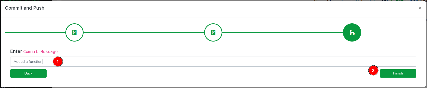 Everything done so far is confined to a virtual filesystem in your browser. To apply these changes, we need to push them. Find the green button at the bottom right of the screen and click on it.