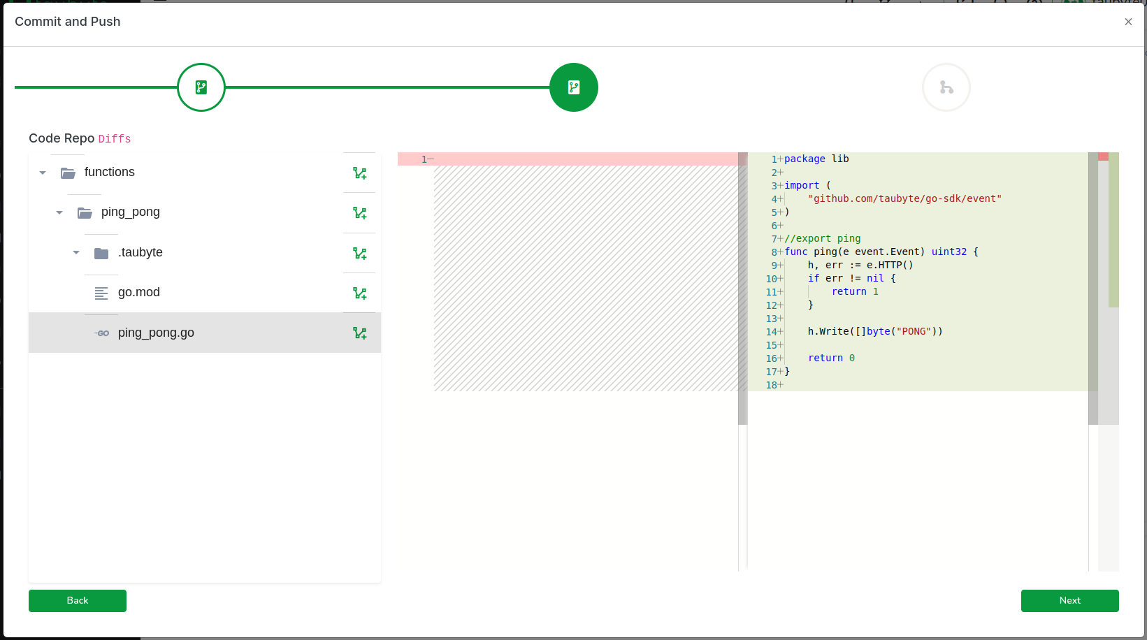 In the editor, you will observe (1) the usual Go files including go.mod, (2) the code for our handler function ping, and (3) a .taubyte folder defining how the function is built.