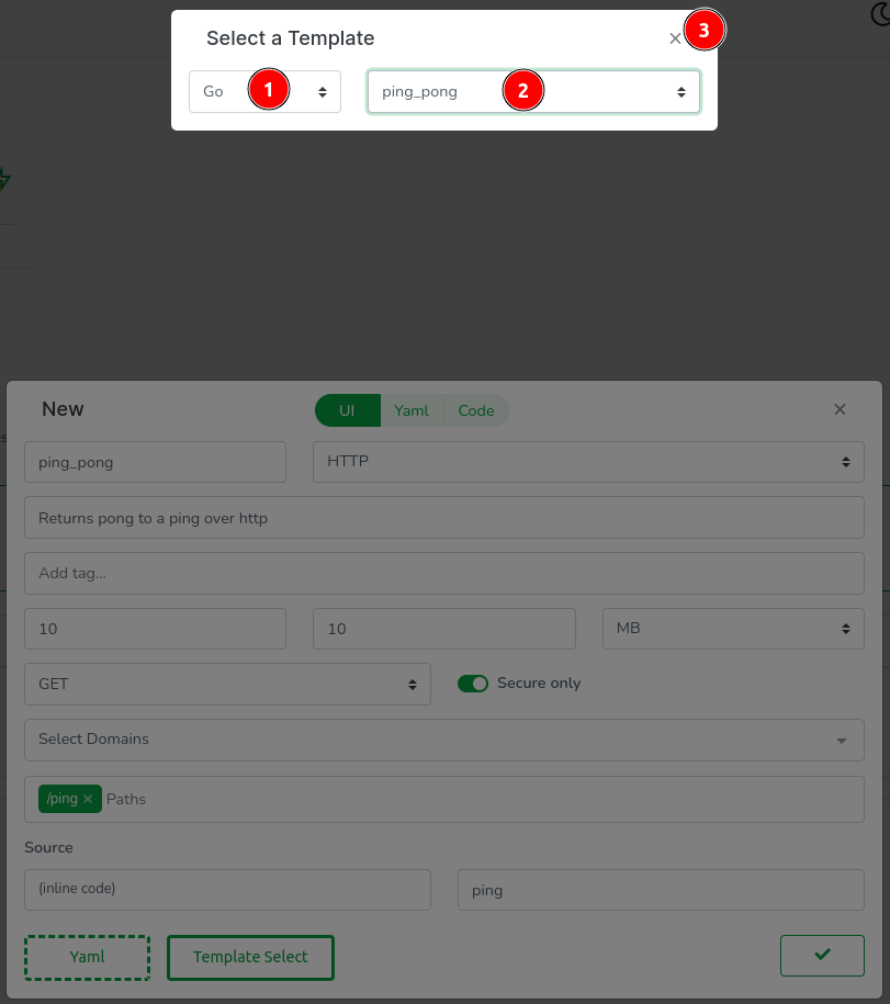 In the template modal: Select Go as the language, choose the ping_pong template, and click 'Close' to exit the modal