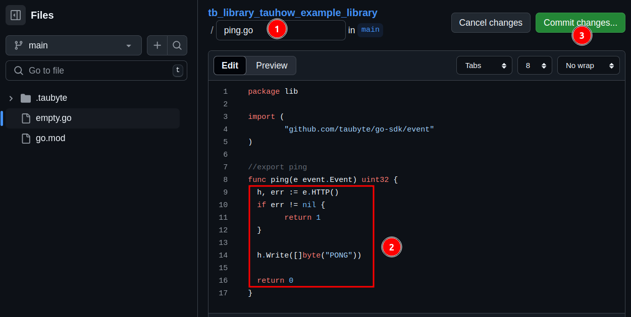 Push the configuration changes. Click on the push button on the bottom right. Save the github repository id (in the example 905452907) and its fullname (in the example taubyte0/tb_library_tauhow_example_library), we'll use them later.